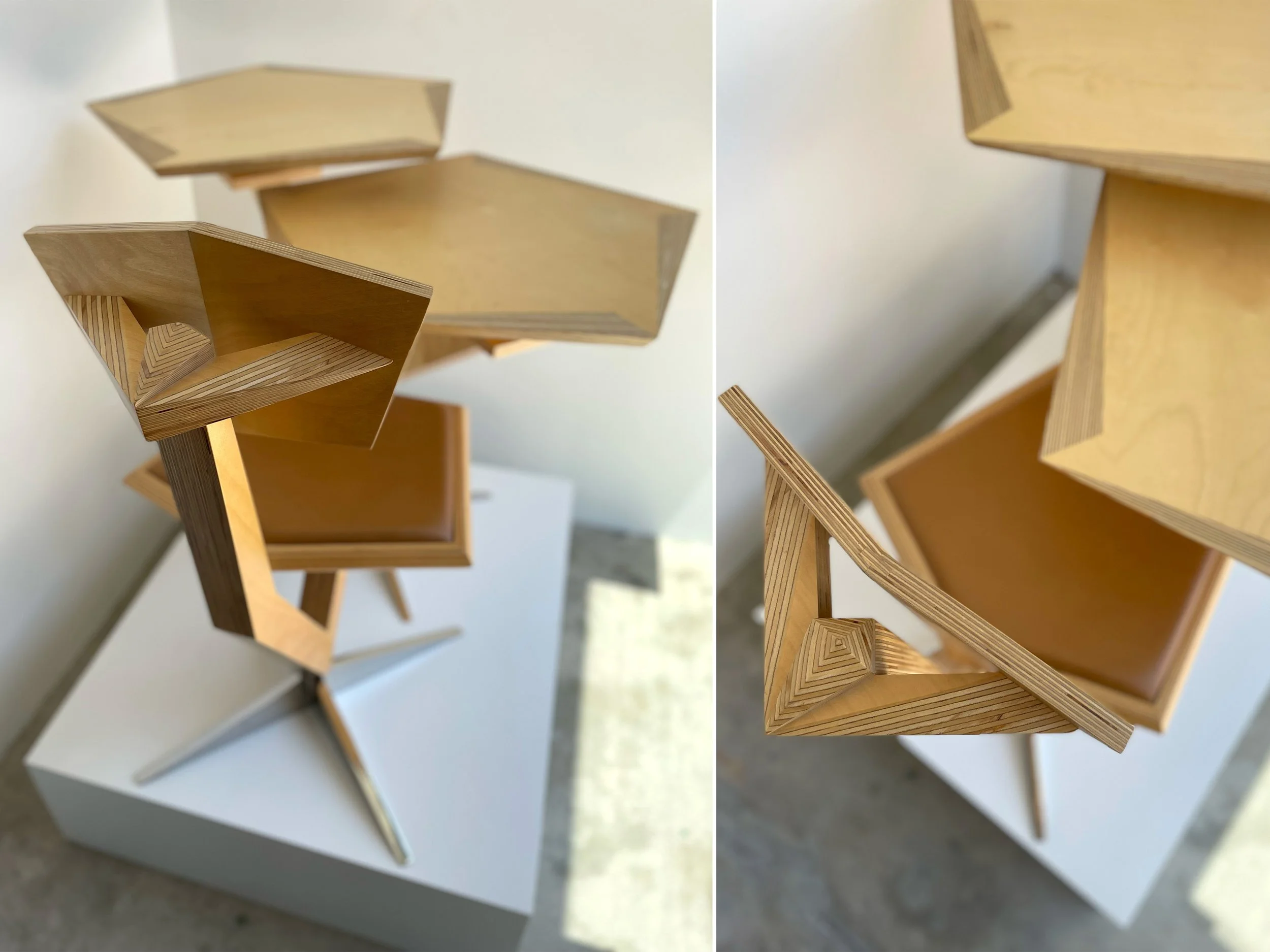 The Finland Ply table and chair started out as a full size mock up but ended up being unexpectedly beautiful. As we shaped the different angles through the plywood, the layers changed thickness and added a whole new dimension to the pieces.